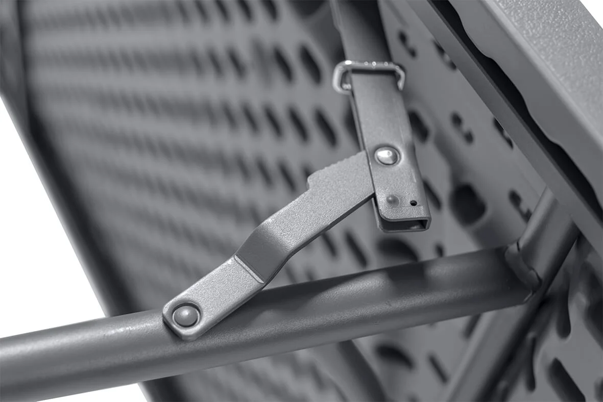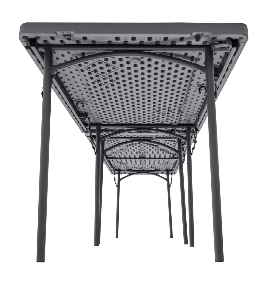 Praktisks un izturīgs galds, kas piemērots gan lietošanai iekštelpās, gan ārā. Galda virsma ir rūdīta un pulverkrāsota, padarot to ļoti izturīgu un ūdensnecaurlaidīgu. Galda kājas fiksējas, nodrošinot, ka galds paliek stabils un priekšmeti paliek uz tā pat vējainā laikā.